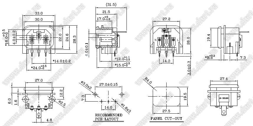 Каталог > Электронные компоненты, радиодетали > Разъёмы (соединители, переходники) > Разъемы AC (разъемы сетевого питания) > Трехполюсные разъемы сетевого питания > IEC 60320 C13/C14 > R-30190(55)