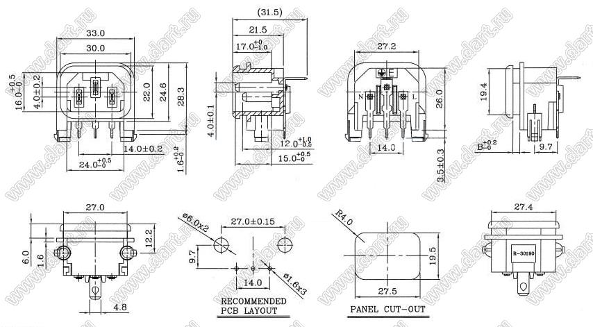 Каталог > Электронные компоненты, радиодетали > Разъёмы (соединители, переходники) > Разъемы AC (разъемы сетевого питания) > Трехполюсные разъемы сетевого питания > IEC 60320 C13/C14 > R-30190(32)