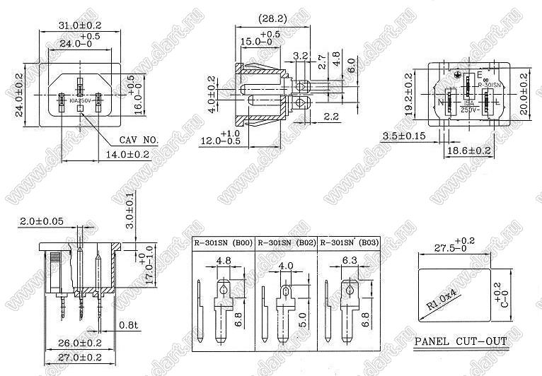 Каталог > Электронные компоненты, радиодетали > Разъёмы (соединители, переходники) > Разъемы AC (разъемы сетевого питания) > Трехполюсные разъемы сетевого питания > IEC 60320 C13/C14 > R-301SN(B00)