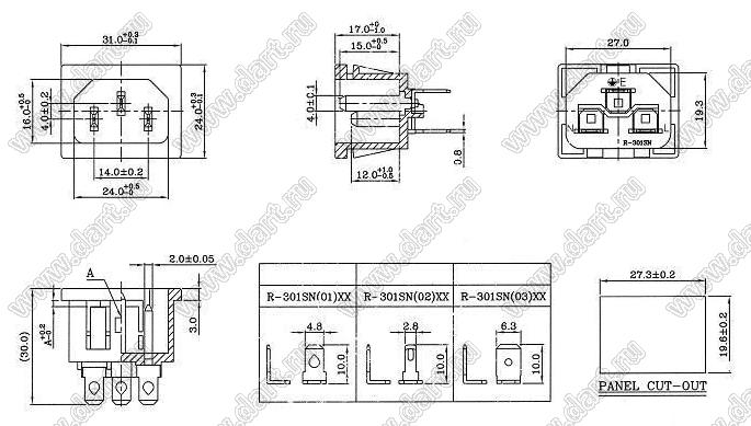 Каталог > Электронные компоненты, радиодетали > Разъёмы (соединители, переходники) > Разъемы AC (разъемы сетевого питания) > Трехполюсные разъемы сетевого питания > IEC 60320 C13/C14 > R-301SN(01)