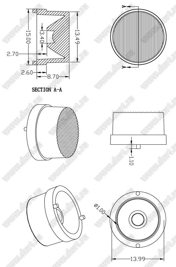 ILENS4-S15-FR1065-NH линза для светодиода; D15*8,7мм; 10*65°; PMMA   ILENS4-S15-FR1065-NH