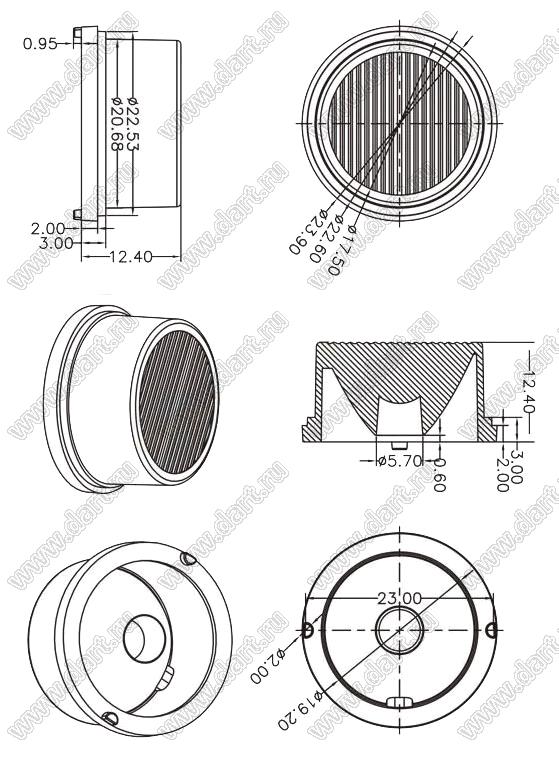 линза для светодиода; D23,9*12,4мм; 20*65°; PMMA