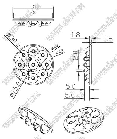 линза для светодиода; D45*8,1мм; 10°, 15°, 20°, 25°, 30°, 38°, 45°, 60°, 80°; PMMA