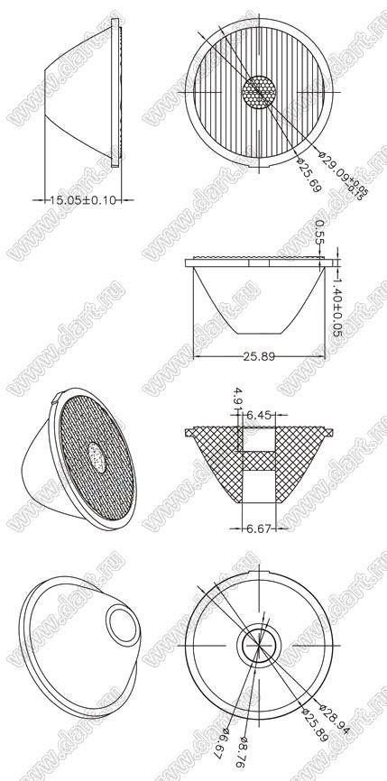линза для светодиода; D29,04*15,05мм; 10*30°; PMMA