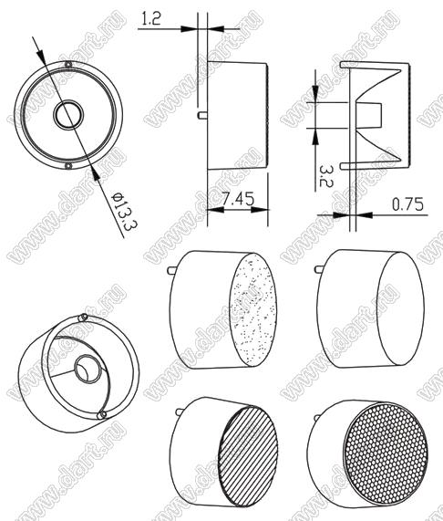линза для светодиода; D13,3*7,35мм; 15°, 20°, 25°, 30°, 38°, 45°, 50°, 60°, 90°, 18*60°, 20*60°, 25*60°; PC