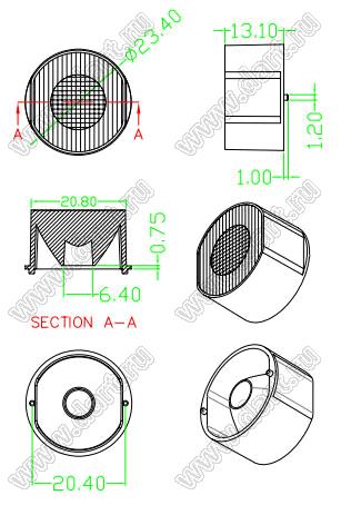 линза для светодиода; D23,4*13,1мм; 15*30°; PC