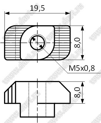 Гайка Т-образная для алюминиевого профиля 20/30/40/45; M5x0,8; A=19,5мм; B=8,0мм; H=8,0мм; сталь нержавеющая 304