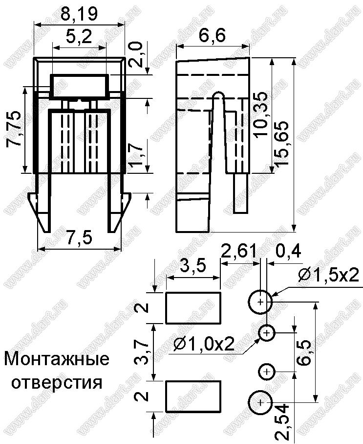 Каталог > Фурнитура для электронных устройств > Держатели и изоляторы компонентов > Держатели светодиодов > Держатели светодиодов угловые на плату > прямоугольные > LEK-520