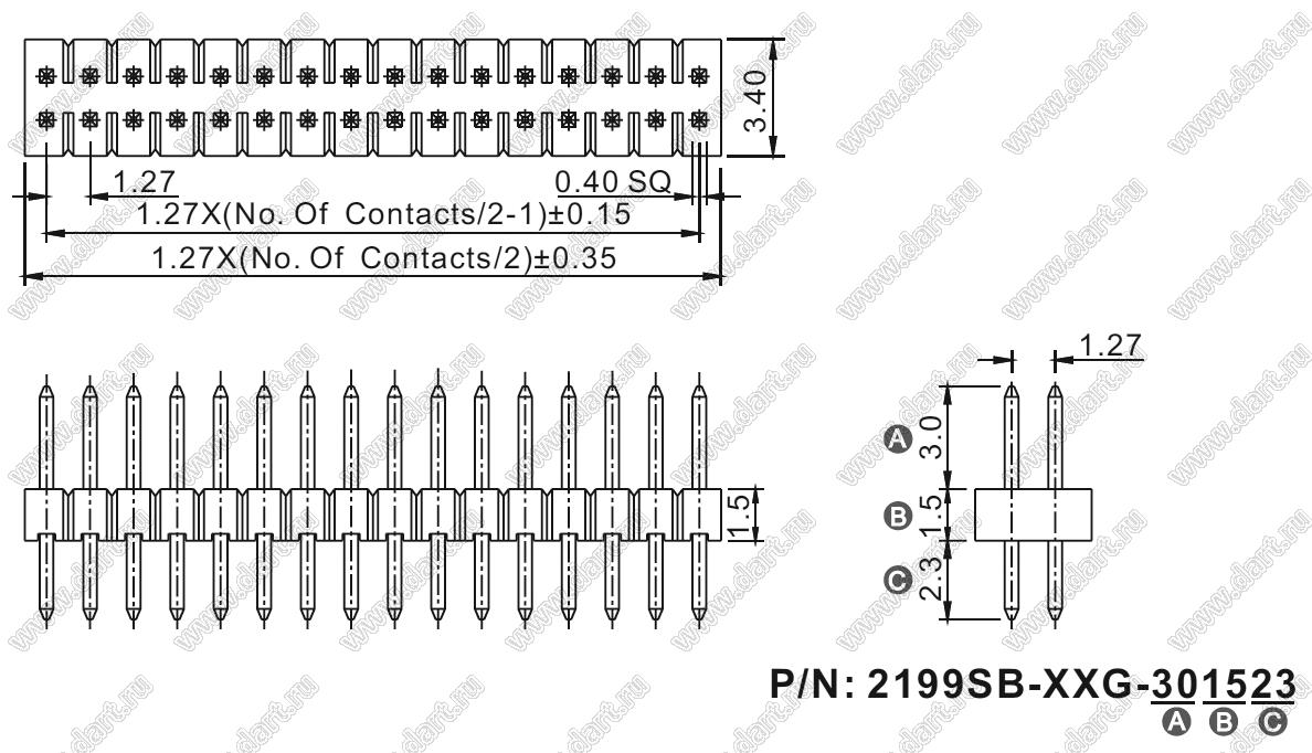 Каталог > Электронные компоненты, радиодетали > Разъёмы (соединители, переходники) > Разъемы плата-плата (межплатные) > шаг 1,27x1,27 мм (разъемы межплатные штыревые и гнезда для них) > двухрядные > 2199SB-XXXG (PLLD1.27) серия > 2199SB-048G-301523 (PLLD1.27-48)