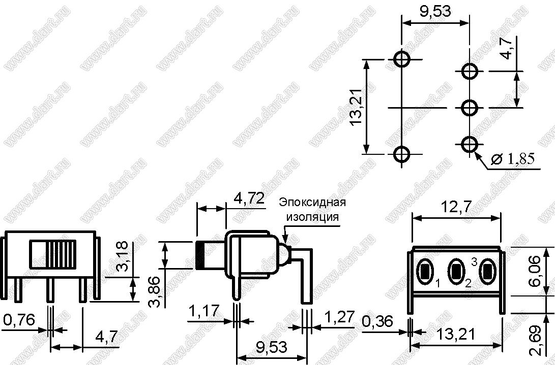 Каталог > Электронные компоненты, радиодетали > Переключатели, кнопки > Переключатели движковые (SLIDE) > Переключатели движковые (SLIDE) угловые > TS-13P-A1-2-Q-E-H (ON-ON, 1P2T)