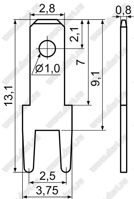 терминал 2,8 мм (0,110”) прямой для пайки в печатную плату; A=13,1мм; латунь никелированая; 0,5мм