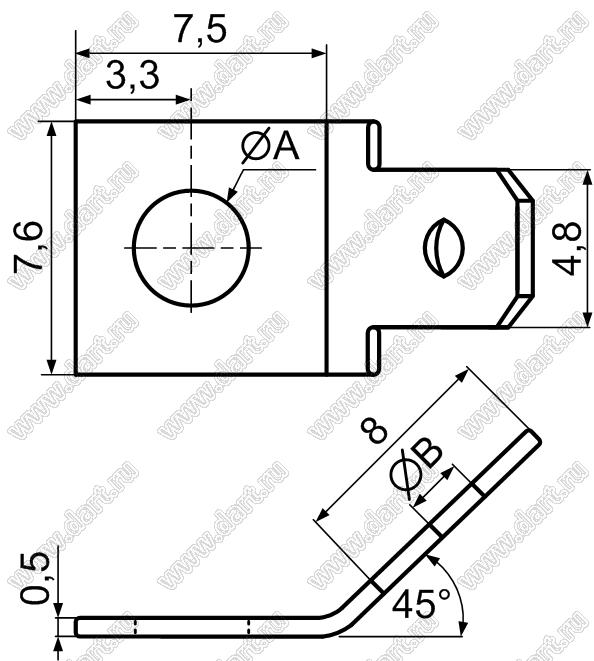 Терминал ножевой 4,8 мм (0,187”) угловой 45град. для печатной платы под винтовое крепление М5; A=5,3мм; 0,5мм; латунь луженая