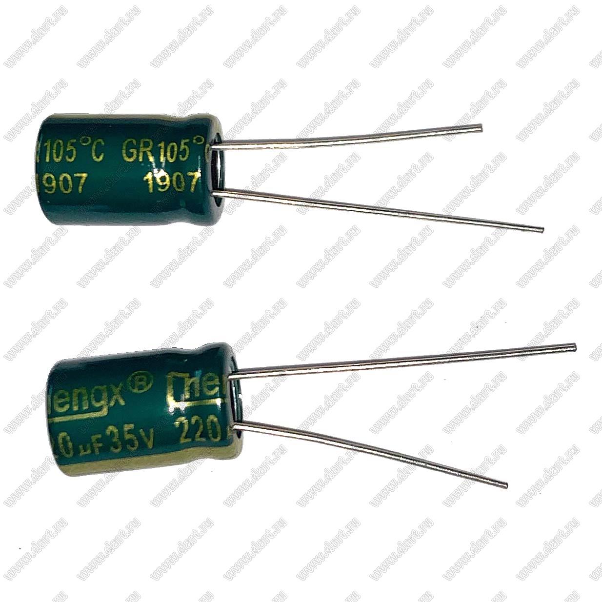 Каталог > Электронные компоненты, радиодетали > Конденсаторы > ECAP - конденсаторы алюминиевые электролитические радиальные > GR/GLR/TN серия > ECAP 220uF/35V 0812 105C (GR227M1AF12, TN1V221M-RBG16 LOW ESR)