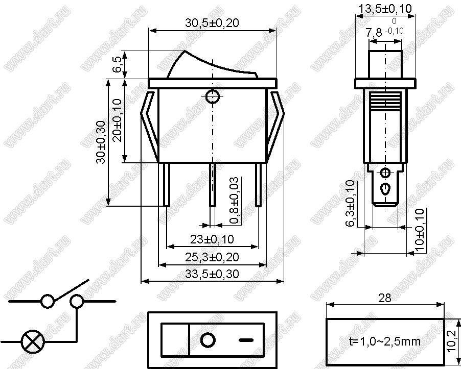 Переключатель клавишный ON-OFF; 30,5х13,5мм; 15A/30A 250VAC; толкатель черный/корпус черный; без подсветки; маркировка "O I"; терминалы 6,3x0,8мм