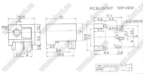 Каталог > Электронные компоненты, радиодетали > Разъёмы (соединители, переходники) > Разъемы вторичного (низковольтного) DC питания > DC гнезда (вторичного низковольтного питания) > DC-004-2.0