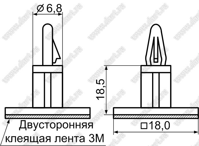 Фиксатор платы с защелкой на самоклеящейся площадке 18x18 мм; A=18,5мм; B=10,0мм; T=1,2...2,0мм; dп=4,0мм; нейлон-66 (UL); натуральный