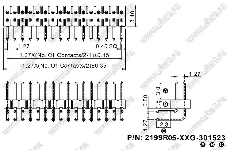 Каталог > Электронные компоненты, радиодетали > Разъёмы (соединители, переходники) > Разъемы плата-плата (межплатные) > шаг 1,27x1,27 мм (разъемы межплатные штыревые и гнезда для них) > двухрядные > 2199R05-XXXG серия > 2199R05-082G-301523