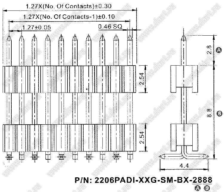 Каталог > Электронные компоненты, радиодетали > Разъёмы (соединители, переходники) > Разъемы плата-плата (межплатные) > шаг 1,27x2,54 мм (разъемы межплатные штыревые и гнезда для них) > однорядные > 2206PADI-XXG-SM-B2-XXXX серия > 2206PADI-48G-SM-B2-2888