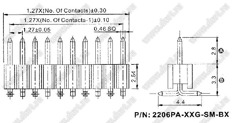 Каталог > Электронные компоненты, радиодетали > Разъёмы (соединители, переходники) > Разъемы плата-плата (межплатные) > шаг 1,27x2,54 мм (разъемы межплатные штыревые и гнезда для них) > однорядные > 2206PA-XXG-SM-B1-XXXX (PLL1.27–XXS) серия > 2206PA-28G-SM-B1-2833 (PLL1.27-28S)