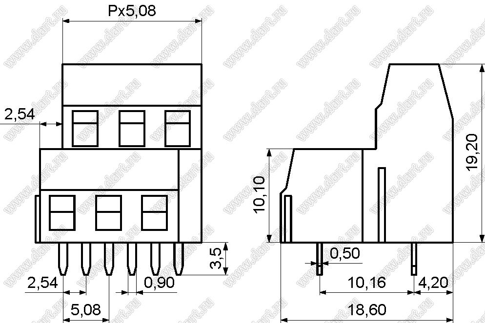 Каталог > Электронные компоненты, радиодетали > Клеммники (колодки клеммные) > Клеммники винтовые для монтажа в отверстия печатных плат > Винтовые клеммники (шаг 5,08 мм) > KF127B-5.08 (DG127B-5.08) серия > KF127B-5.08-03P-14