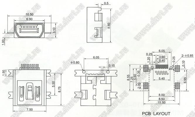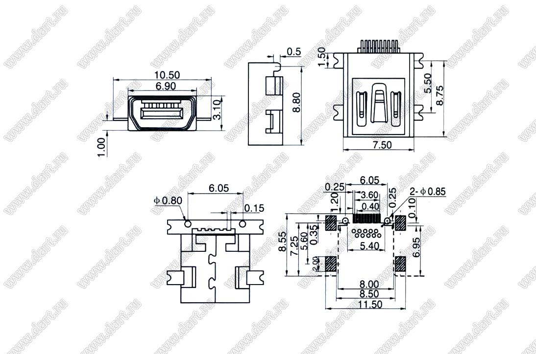 Каталог > Электронные компоненты, радиодетали > Разъёмы (соединители, переходники) > Разъемы USB > Разъемы мини USB > US10-045 (HW-F-010-05)