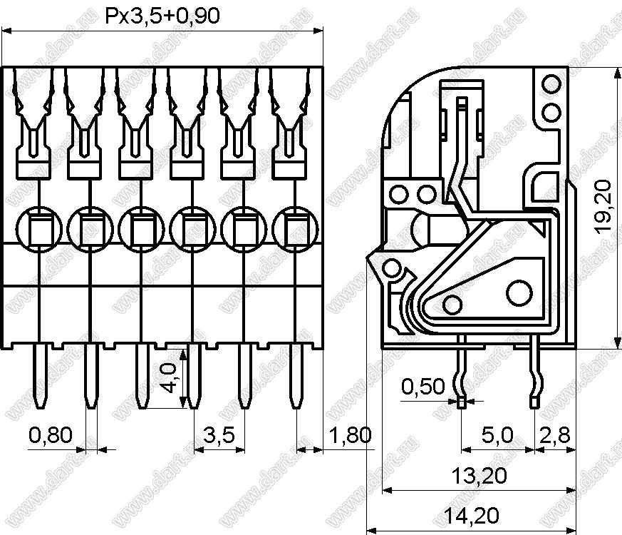 Каталог > Электронные компоненты, радиодетали > Клеммники (колодки клеммные) > Клеммники нажимные безвинтовые для монтажа в отверстия печатных плат > Клеммники нажимные безвинтовые (шаг 3,5 мм) > KF250-3.5C серия > KF250-3.5C-01P-11