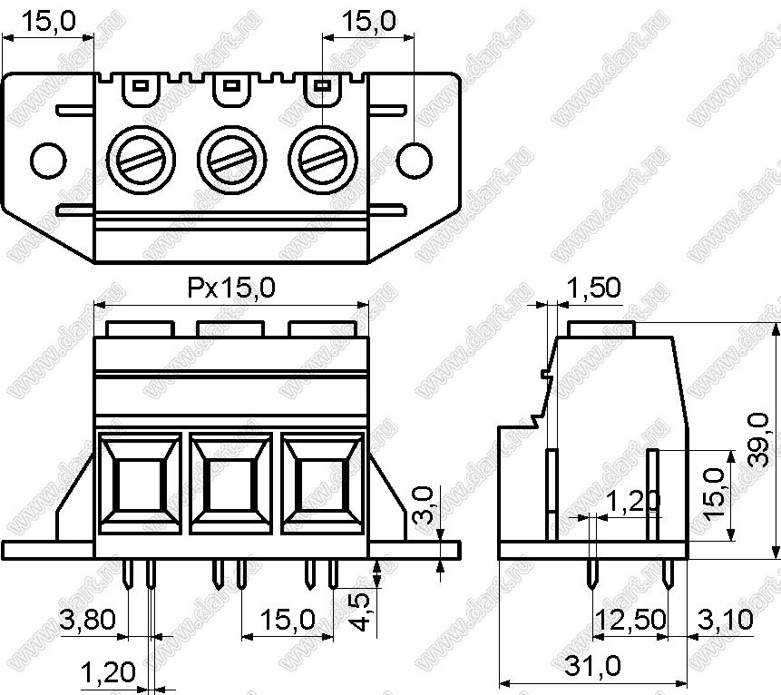 Каталог > Электронные компоненты, радиодетали > Клеммники (колодки клеммные) > Клеммники винтовые для монтажа в отверстия печатных плат > Винтовые клеммники (шаг 15,0 мм) > KF137TM-15.0 (DG137TM-15.0) серия > KF137TM-15.0-09P-14
