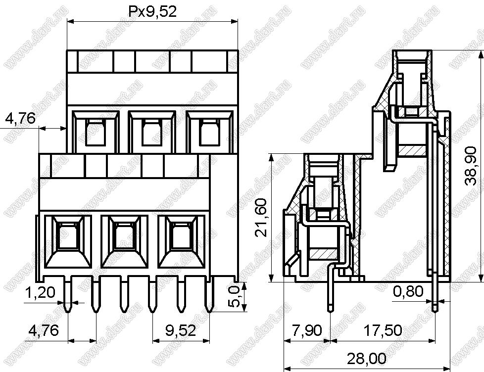 Каталог > Электронные компоненты, радиодетали > Клеммники (колодки клеммные) > Клеммники винтовые для монтажа в отверстия печатных плат > Винтовые клеммники (шаг 9,52 мм) > KF950B-9.52 серия > KF950B-9.52-03P-14